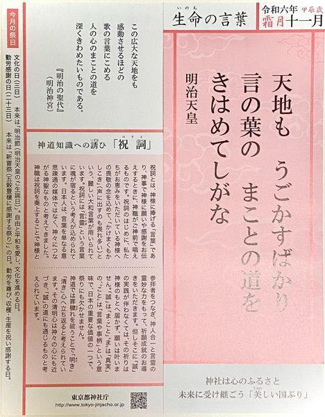 毎月はじめに東京都台東区の蔵前にある諏訪神社で生命(いのち)の言葉の用紙をいただいております。