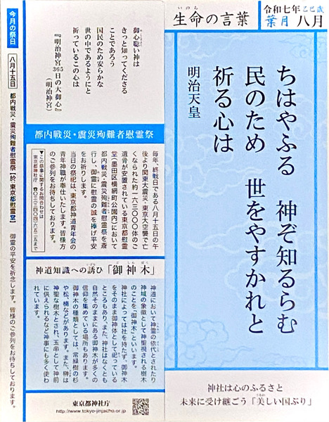 毎月はじめに東京都台東区の蔵前にある諏訪神社で生命(いのち)の言葉の用紙をいただいております。