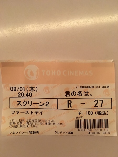 先月からTOHOシネマズのシネマイレージ会員になりましたので、この日も夜20:40から映画『君の名は』を観ました。
