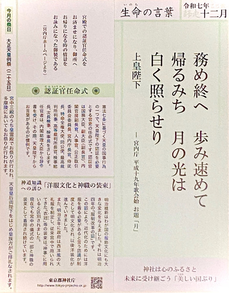 毎月はじめに東京都台東区の蔵前にある諏訪神社で生命(いのち)の言葉の用紙をいただいております。